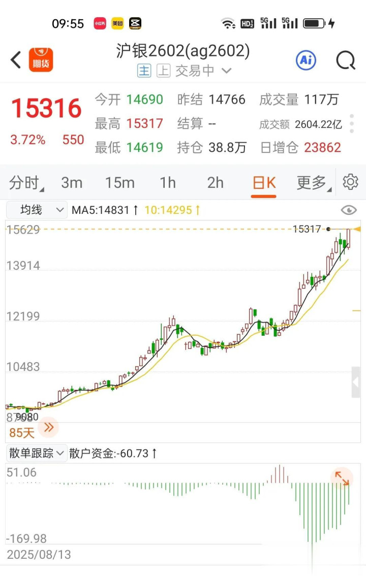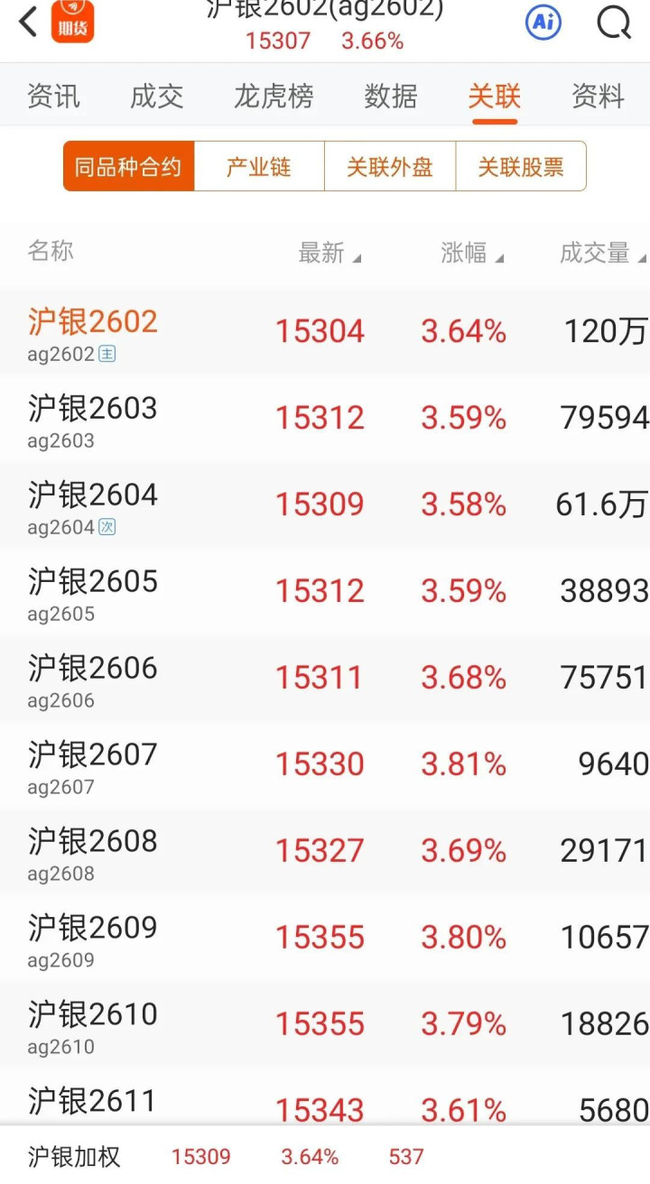 沪银2602盘中大幅拉升3.72%,期价15316。