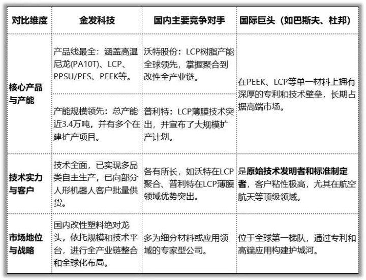 金发科技在该领域的优势在于技术、规模与应用端的综合布局。它与国内外主要竞争对手的对比情况如下表所示: