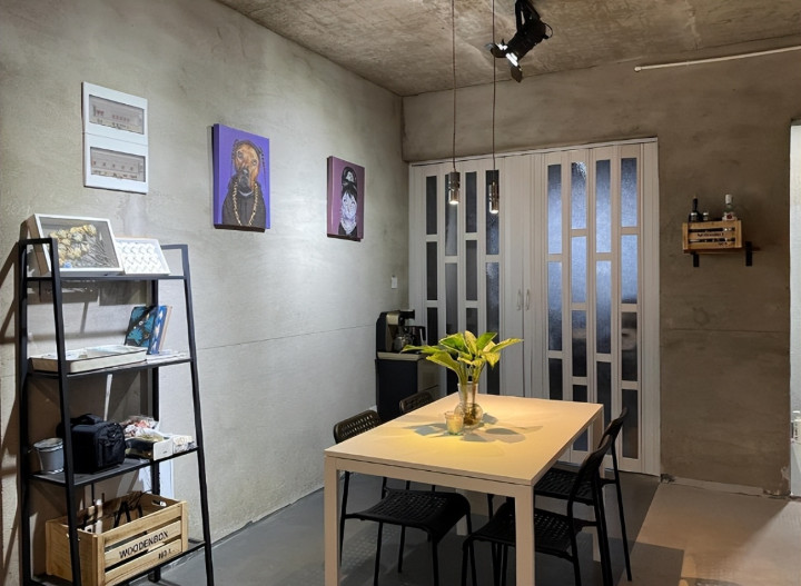 黑色的置物架、工业风的吊灯以及黑白搭配的餐桌椅,相得益彰地融入了水泥质感的墙面和地面,展现了一种冷静且硬朗的风格。