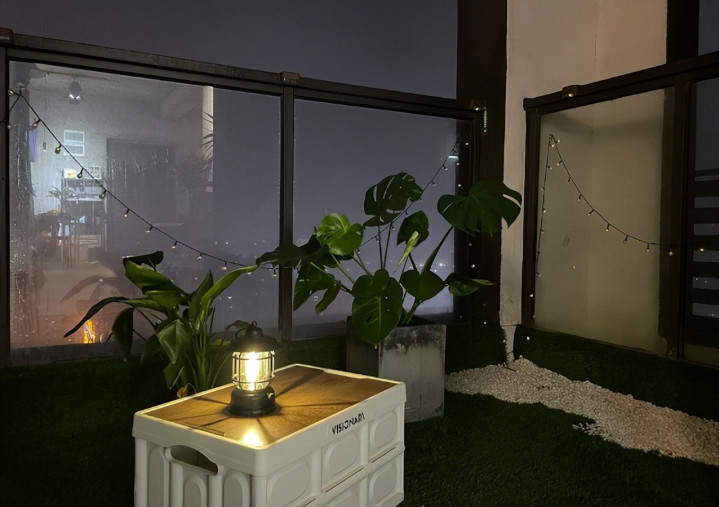 阳台部分,屋主并没有做封闭改造,而是选择了铺设仿真草皮,搭配LED氛围灯和一组休闲桌椅,整个阳台看起来既慵懒又惬意。